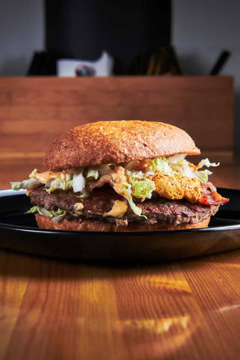Bacon, spiced butter, Chinese cabbage, dressing, onion, and pickles. Allergen: milk, soy, eggs, mustard, oats and wheat